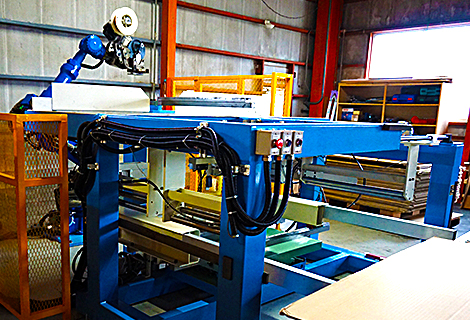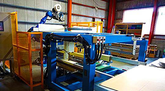 ロボッチM1800強化段ボールの折り目を自動で折り、ワイヤー止めまでを完全自動で行うことで、省人化・省力化を可能にします。(大分事業部所有)
