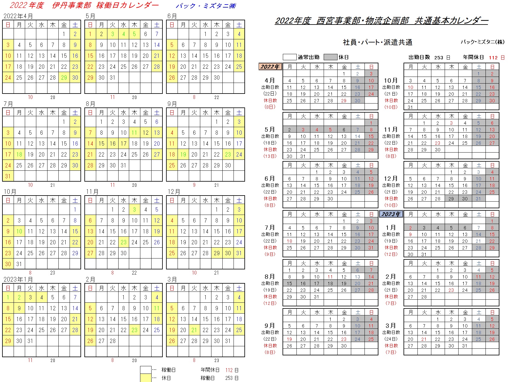 2022年度の就業カレンダー掲載!〈伊丹事業部・西宮事業部〉