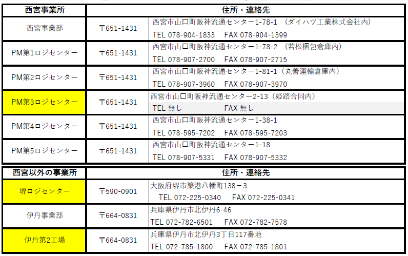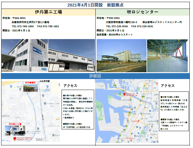 この度、弊社は伊丹第二工場、堺ロジセンター、PM第3ロジセンターを4月1日に新設し、営業を開始いたしました。