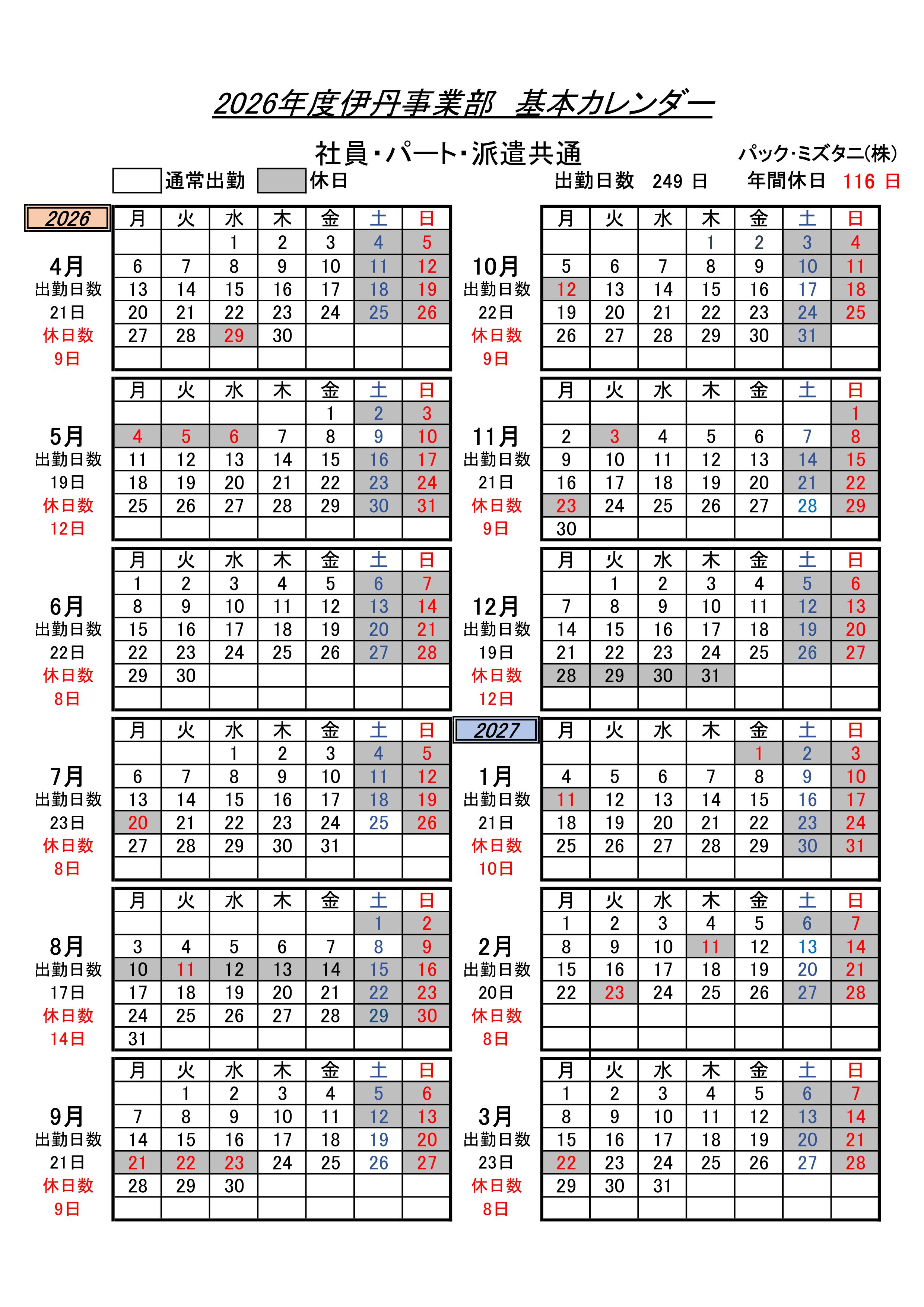 当社の2026年度就業カレンダーをお知らせいたします。