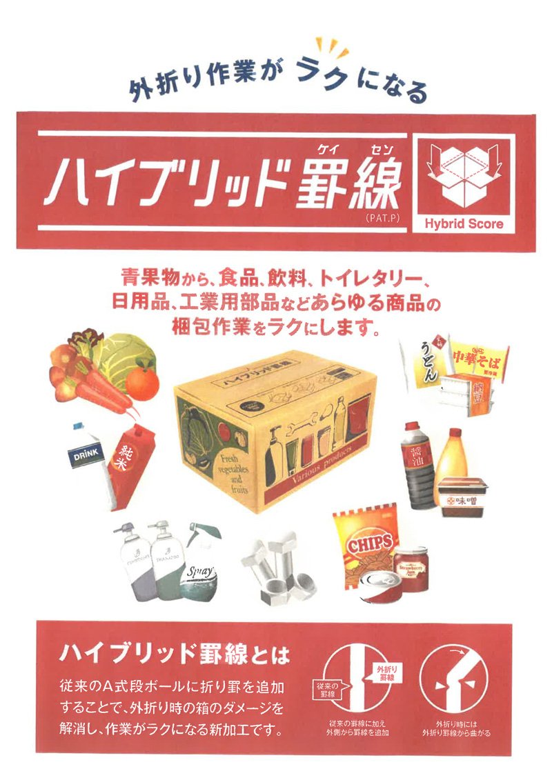 A式段ボールに折り罫を追加し、外折り時の箱のダメージを解消し、作業がラクになる新加工のハイブリッド罫線!